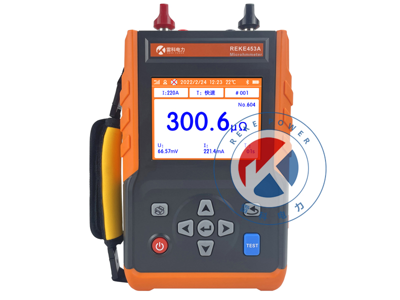 REKE-453A手持式回路電阻測試儀(又稱微歐計)是一款專為測量高壓開關、斷路器接觸電阻及金屬導體回路電阻而設計的精密儀器。內(nèi)置高精度A/D轉(zhuǎn)換器與程控電流源,可輸出高達100A的無紋波直流電流,支持多檔位調(diào)節(jié)與定時連續(xù)測試。具備開路、過熱等多重保護,抗干擾能力強。采用5.6寸彩色LCD屏,操作簡單,便于攜帶,支持數(shù)據(jù)存儲與藍牙APP連接,可實現(xiàn)GPS定位、數(shù)據(jù)上傳、報告生成等功能,顯著提高現(xiàn)場檢測效率。